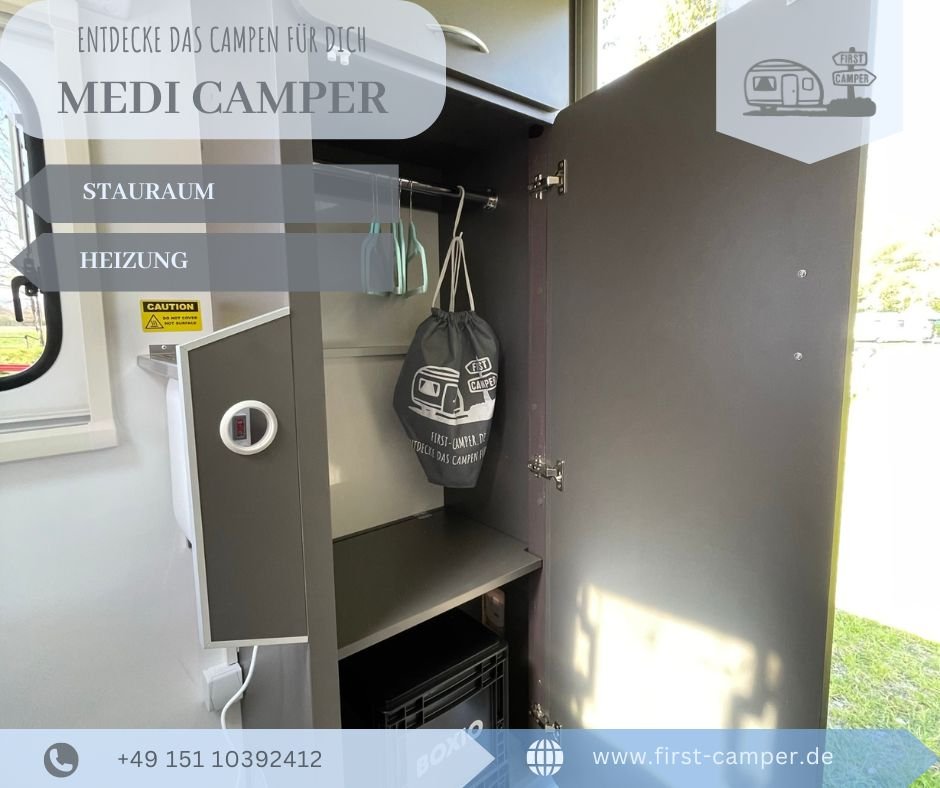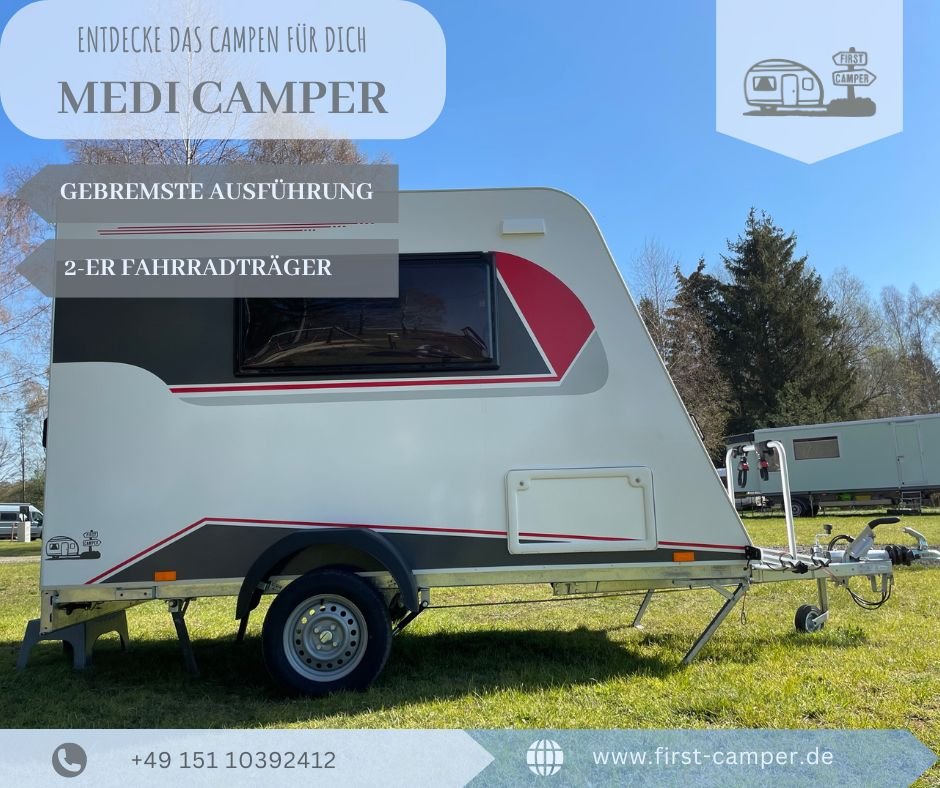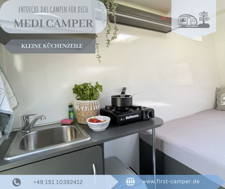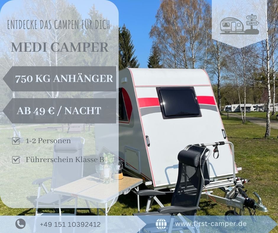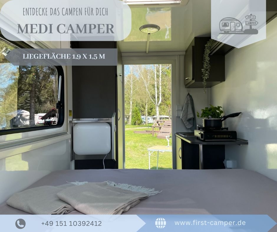 ENTDECKE DAS CAMPEN FÜR DICH Unser kompakter und komfortabler Wohnwagen für zwei Personen. Mit einem zulässigen Gesamtgewicht von 750 kg ist unser Medi Camper ein Leichtgewicht unter den Wohnwagen und kann mit einem Führerschein der Klasse B gefahren werden. Das bedeutet, dass man mit dem Camper unabhängig und flexibel unterwegs ist, ohne sich um eine zusätzliche Fahrerlaubnisse kümmern zu müssen. In dem großzügigen Innenraum unseres Medi Campers befindet sich eine komfortable Liegefläche von 192 x 150 cm, auf der man sich nach einem ereignisreichen Tag erholen und entspannen kann. Unter dem Bett befindet sich ausreichend Stauraum für all Eure persönlichen Gegenstände und Campingausrüstung. Dabei ist der Stauraum von außen über eine bequeme Seitenklappe zugänglich. Der Innenraum unseres Medi Campers wird durch ein Ausstellfenster, ein Frontfenster und einem Dachfenster mit integriertem Moskitoschutz und Verdunklungssystem optimal belüftet und mit Licht durchflutet. So könnt Ihr stets eine angenehme Atmosphäre genießen, unabhängig von den Wetterbedingungen draußen. In der Küchenzeile befindet sich eine Abwaschgelegenheit und ein separater 1-flammiger Gaskocher. Gerne kann nach Wunsch eine Trockentrenntoilette dazu gemietet werden. SERVICEPAUSCHALE: In der Servicepauschale i.H.v. 59€ sind folgende Leistungen enthalten: Als Leihgabe: 2 Adapterkabel (CEE Stecker), Kabeltrommel oder Verlängerungskabel, Sicherungskeile, Kochgeschirr, Essbesteck, Gläser etc. für 2 Personen, Portabler Gaskocher inkl. 1 Gaskartusche, Abwaschutensilien, Handfeger, Einstiegshilfe, 1 Campingtisch und 2 Stühle, Sonnensegel. Einweisung und Endabnahme. ENDREINIGUNG IST INKLUSIVE Der Wohnwagen wird besenrein vom Mieter zurückgegeben, die Endreinigung übernehmen wir! VERSICHERUNG: Vollkasko-Versicherung mit 500€ Selbstbeteiligung je Schadensfall Teilkasko-Versicherung mit 500€ Selbstbeteiligung je nach Schadensfall Haftpflichtversicherung mit pauschal 100 Mio. € Deckungssumme (Personenschaden mit max. 15 Mio. € pro Person) KAUTION: 500€ sind bis zu 7 Tagen vor Reiseantritt zu überweisen. Wird das Fahrzeug ohne Mängel zurückgegeben wird die Kaution zurückerstattet. SONSTIGE KOSTEN: Schäden oder Unfall 500€ Selbstbeteiligung je Schadensfall Außenreinigung bei starker Verschmutzung 45€ |