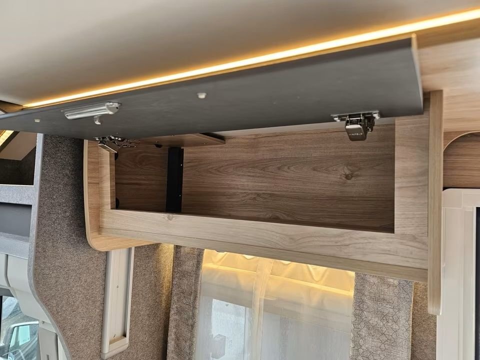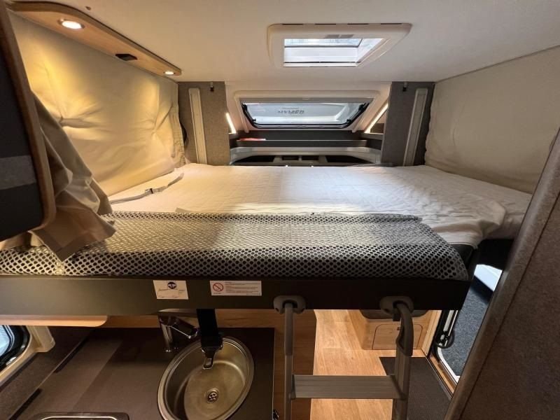 Das Fahrzeug ist ausgestattet mit 2 Einzelbetten, diese können zu einem Doppelbett umgebaut werden. Im vorderen Bereich, oberhalb der L-Sitzgruppe, befindet sich zusätzlich ein großes Hubbett, so dass die Kinder ihren eigenen Schlafbereich haben hat.