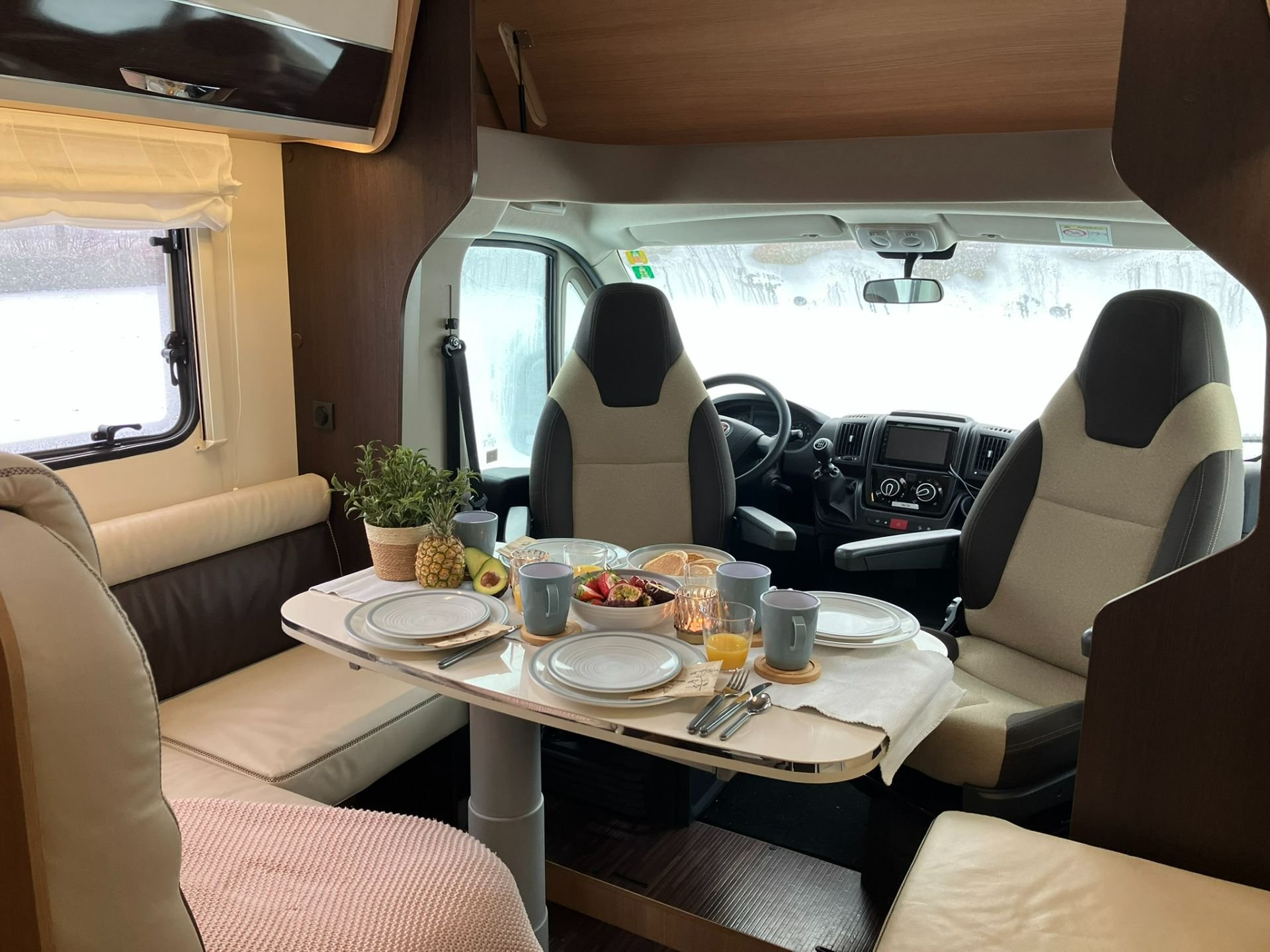 Fahrzeug Modell 2021 140PS Fiat Motor mit Schaltgetriebe Drehbarer Fahrer- und Beifahrersitz Tempomat Navigation mit Rückfahrkamera 120l Frischwassertank 100l Grauwassertank 5 Sitz- und Schlafplätze Zulässiges Gesamtgewicht 3500kg Außenausstattung Markise 3,5m Fahrradträger für 4 Fahrräder (60kg) Campingtisch bis zu 5 Campingstühle CEE Adapter 15m Kabel Kabeltrommel Wasserschlauch Außenbeleuchtung kompakter Gasgrill Innenausstattung Heizung: Truma Combi Dachklimaanlage 2x Isofix hinten USB Steckdose Fliegengitter und Verdunklungsrollos Bad mit separater Dusche großes Bett im Alkoven 2 Betten im hinteren Bereich (können zu einem großen Bett umgebaut werden) gemütliche Sitzkombination am Tisch Küche Gaskochfeld mit 3 Flammen großer Kühlschrank (142l) mit Gefrierfach und Getränkefach Wasserkocher (für Kochfeld) Bosch Tassimo Kaffeemaschine Teller, Tassen, Gläser und Besteck für 4 Personen Pfannen und Topf Set |