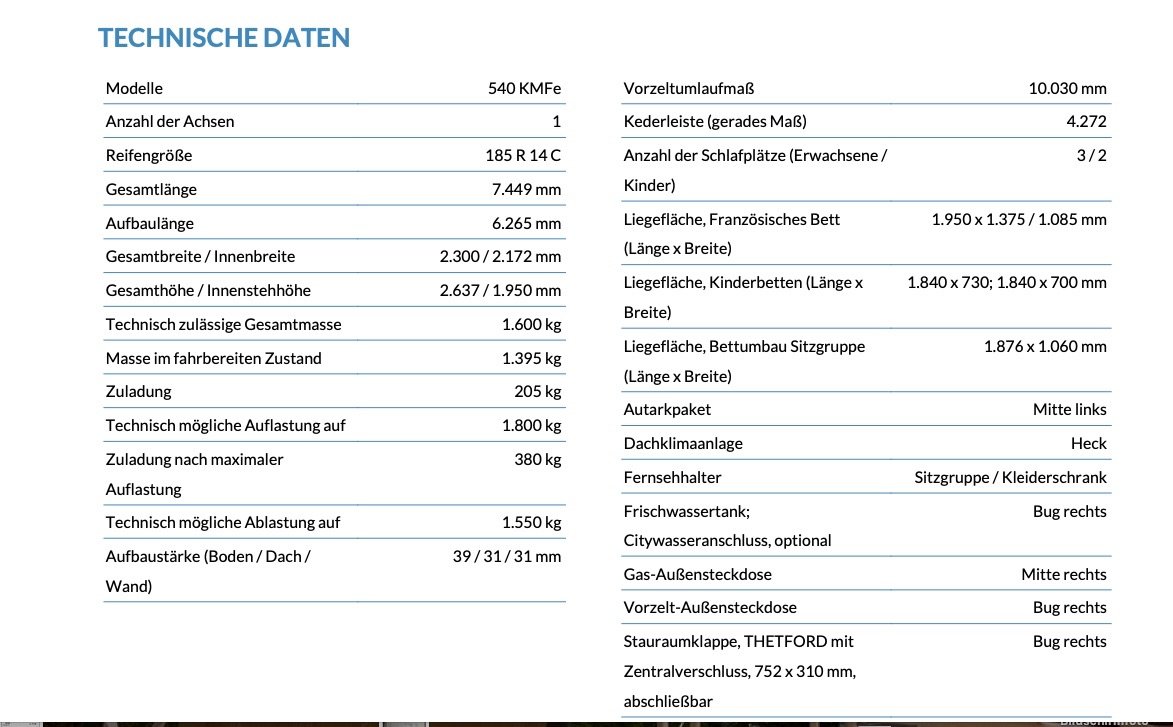 | Sonstige | 2. Versorgungsbatterie Campingset Fahrradträger (für 2 Räder) Haustiere erlaubt Warmwasser Wasseranschluss Wintertauglich |